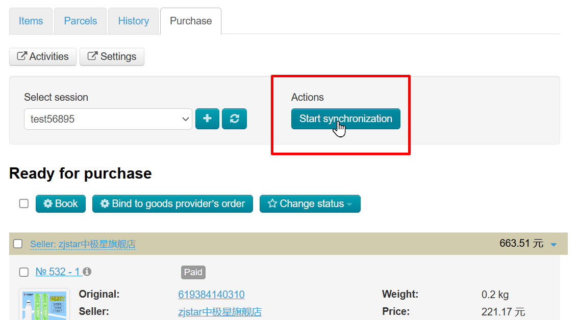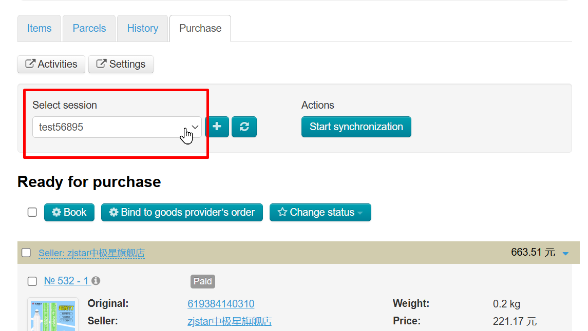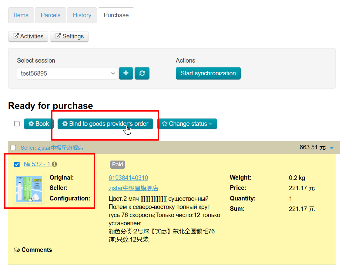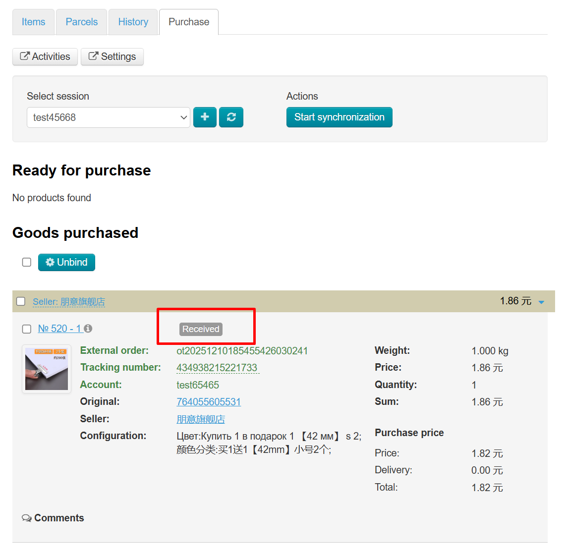 After the purchase, during synchronization, the statuses in the admin panel will change, and items 'Ready for Purchase' will move to the 'Goods purchased' section: