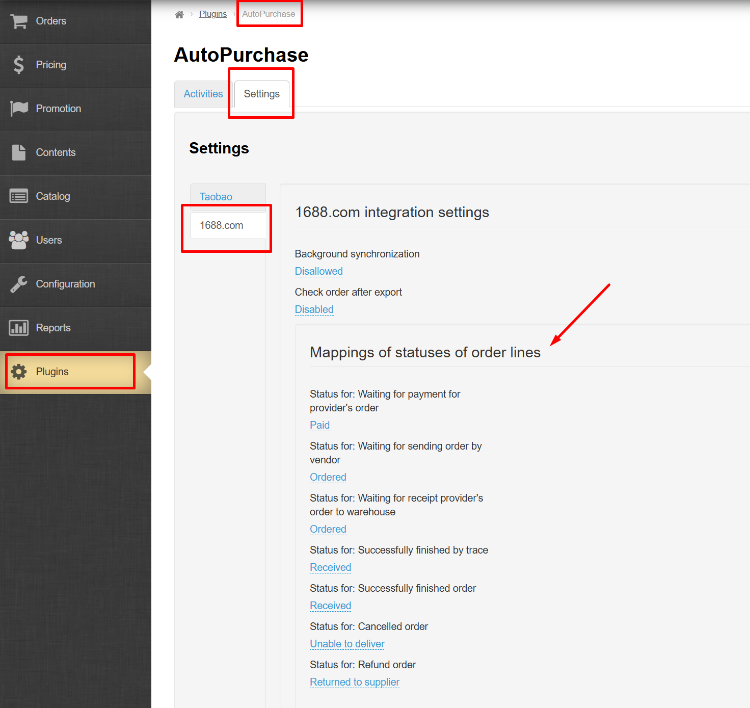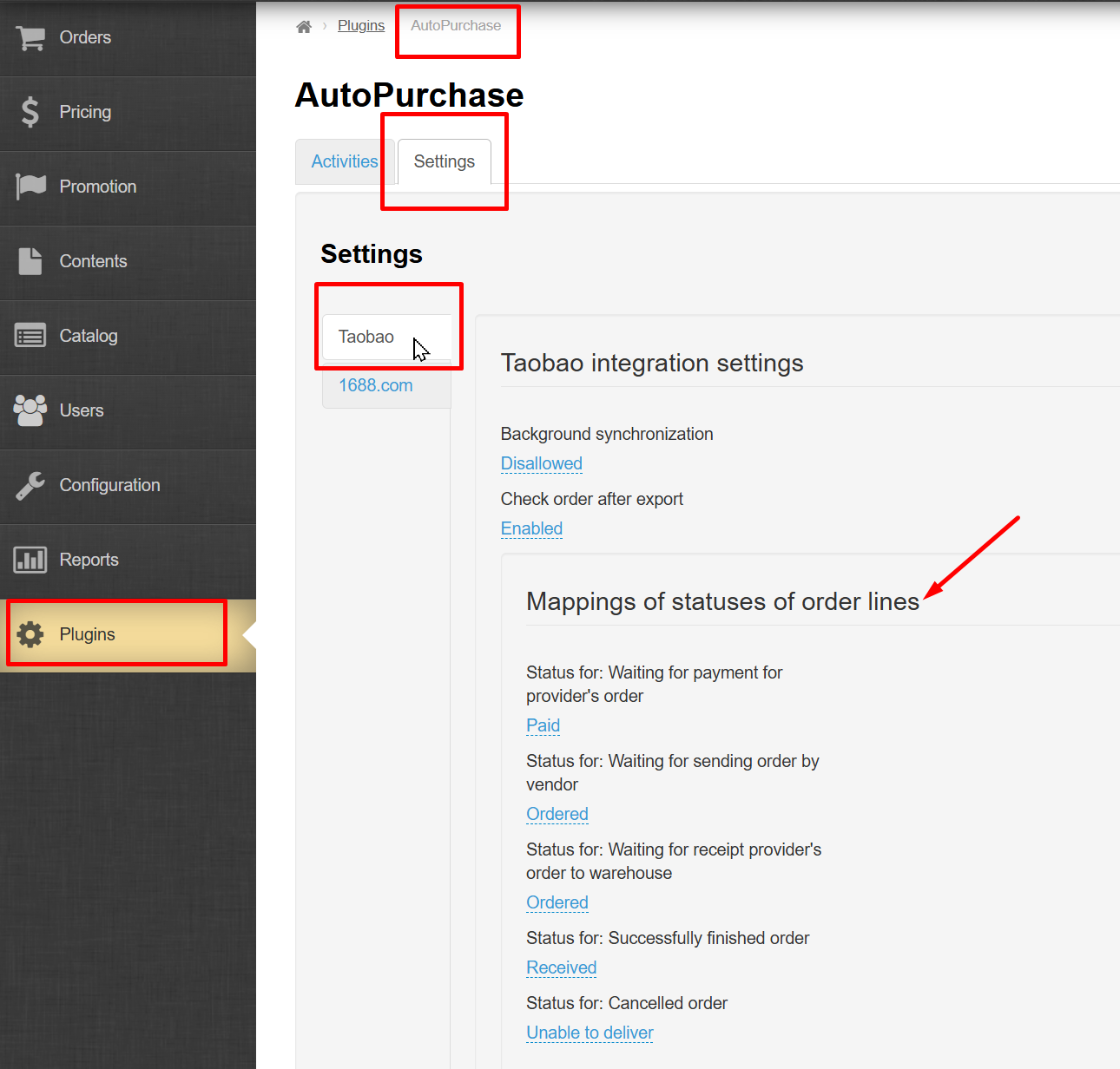 Status name configuration (status mapping) is done in the "Plugins — AutoPurchase — Settings" section (we recommend leaving the default names). Configuration is done separately for Taobao and 1688.com: