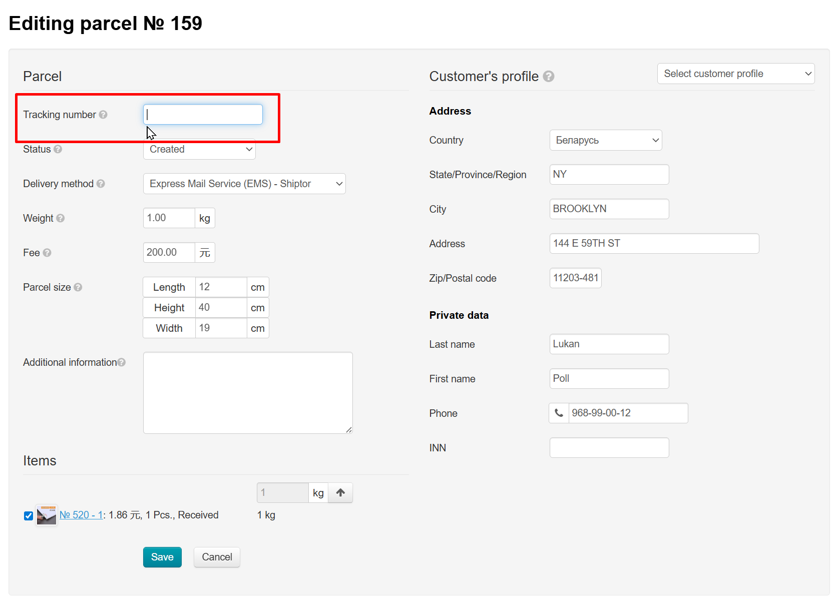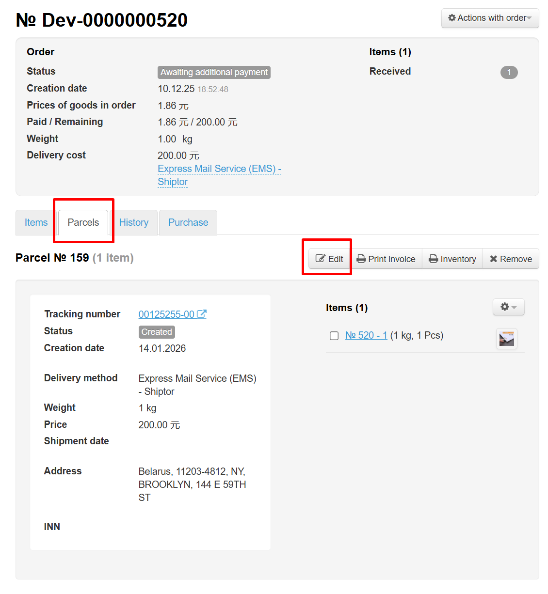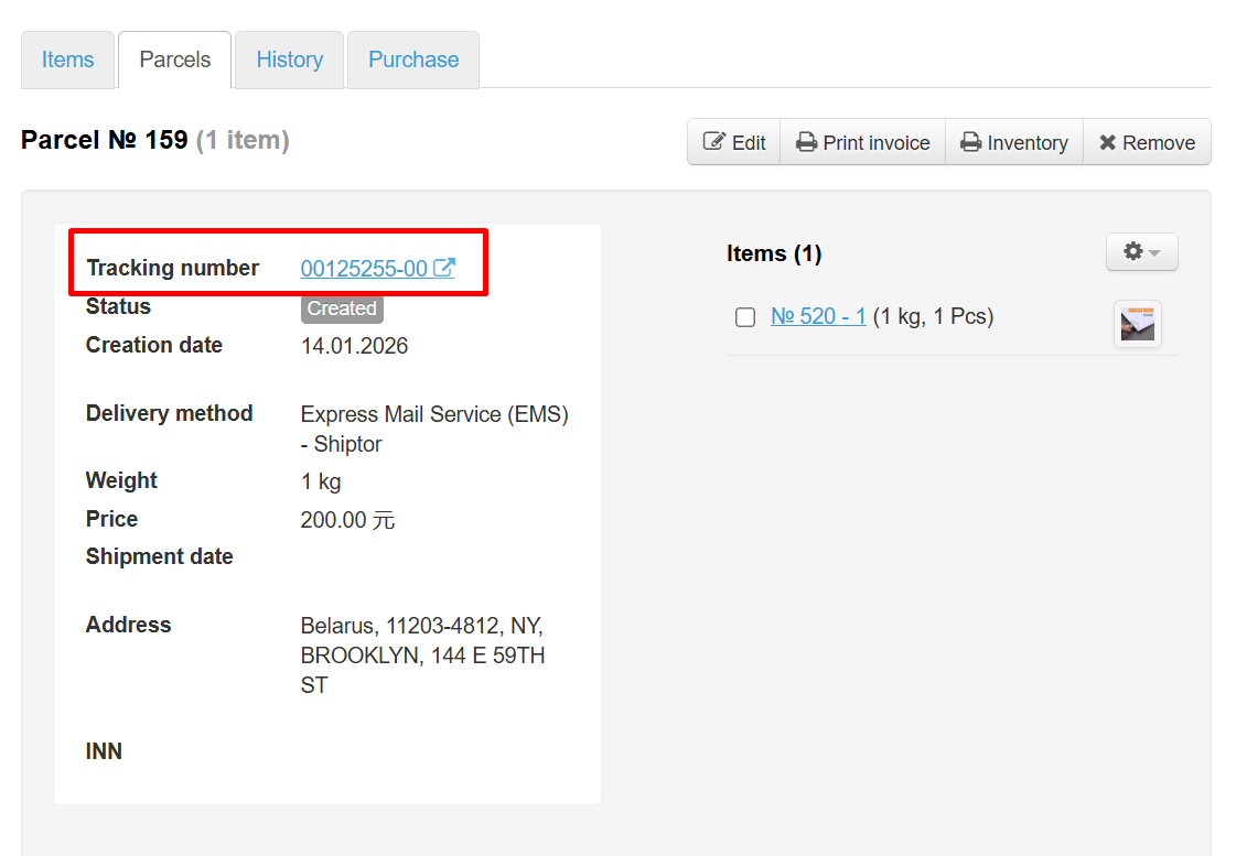 When all items arrive at the warehouse you specified in the settings, the package formation process begins (weighing, packing, etc.). Once the package is formed and a tracking number is assigned, this information is transferred to the OT Box during automatic synchronization. You can find the tracking number on the 'Parcel' tab: